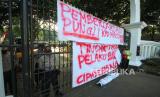 REPUBLIKA.CO.ID, BANDUNG -- Petugas kepolisian berjaga di gerbang Balai Kota Bandung, saat aksi unjuk rasa mahasiswa Kelompok Cipayung, Senin (2/8).