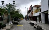 Sepinya jalur pedestrian Malioboro, Yogyakarta, Senin (2/8). Selama PPKM jumlah kunjungan wisatawan ke Malioboro anjlok. Dan Pemerintah kembali memperpanjang PPKM hingga 9 Agustus mendatang. (FOTO : Wihdan Hidayat / Republika)