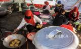 Sejumlah warga memasak menu makanan untuk warga yang menjalani isolasi mandiri dan terdampak Covid-19 di Dapur Umum dan Posko Bantu Isolasi Mandiri di Cipedes, Sukajadi, Kota Bandung, Selasa (3/8). Komunitas Sahabat Uncle Teebob bersama warga RW 05 Kelurahan Cipedes berinisiatif untuk membagikan 300 porsi makanan serta multivitamin per hari bagi warga yang menjalani isolasi mandiri dan warga terdampak Covid-19 saat perpanjangan PPKM Level 4 di Bandung Raya sebagai bentuk kepedulian terhadap sesama. Foto: Republika/Abdan Syakura (FOTO : REPUBLIKA/ABDAN SYAKURA)