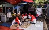 Warga menyiapkan makanan untuk warga yang menjalani isolasi mandiri dan terdampak Covid-19 di Dapur Umum dan Posko Bantu Isolasi Mandiri di Cipedes, Sukajadi, Kota Bandung, Selasa (3/8). Komunitas Sahabat Uncle Teebob bersama warga RW 05 Kelurahan Cipedes berinisiatif untuk membagikan 300 porsi makanan serta multivitamin per hari bagi warga yang menjalani isolasi mandiri dan warga terdampak Covid-19 saat perpanjangan PPKM Level 4 di Bandung Raya sebagai bentuk kepedulian terhadap sesama. Foto: Republika/Abdan Syakura (FOTO : REPUBLIKA/ABDAN SYAKURA)