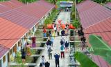 REPUBLIKA.CO.ID,PADANG -- Seorang nakes memandu pasien COVID-19 untuk senam sore di tempat isolasi Perumahan Nelayan, Padang, Sumatera Barat, Selasa (3/8/2021).