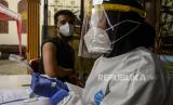Tenaga kesehatan menyuntikan vaksin Covid-19 kepada warga di Masjid Jami Al- Hidayah, Tebet, Jakarta, Rabu (4/8). Masjid Jami Al-Hidayah menjadi salah satu tempat diselenggarakannya vaksinasi untuk mendukung gerakan percepatan vaksinasi nasional. Sebanyak 220 vaksin jenis Sinovac dan Astrazeneca disediakan setiap harinya bagi warga di Kecamatan Tebet dan sekitarnya yang diselenggarakan hingga Jumat (6/8). (FOTO : Republika/Putra M. Akbar)