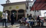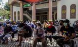 Sejumlah warga menunggu giliran untuk disuntik vaksin Covid-19 di Masjid Jami Al- Hidayah, Tebet, Jakarta, Rabu (4/8). Masjid Jami Al-Hidayah menjadi salah satu tempat diselenggarakannya vaksinasi untuk mendukung gerakan percepatan vaksinasi nasional. Sebanyak 220 vaksin jenis Sinovac dan Astrazeneca disediakan setiap harinya bagi warga di Kecamatan Tebet dan sekitarnya yang diselenggarakan hingga Jumat (6/8). (FOTO : Republika/Putra M. Akbar)