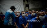 REPUBLIKA.CO.ID, JAKARTA -- Warga binaan Orang Dalam Gangguan Jiwa (ODGJ) menunggu giliran untuk disuntik vaksin Covid-19 AstraZeneca di Yayasan Jambrud Biru, Kota Bekasi, Jawa Barat, Rabu (4/8). Dari total 166 orang warga binaan di yayasan tersebut, sebanyak 70 orang yang lolos proses screening dan dapat menerima vaksin Covid-19 dosis pertama pada program vaksinasi merdeka.