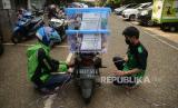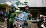 Pengemudi ojek online membawa bantuan paket nutrisi isolasi mandiri yang akan didistribusikan untuk pasien Covid-19 di Kantor Dompet Dhuafa, Ciputat, Tangerang Selatan, Banten, Rabu (4/8). Dari awal Juli hingga saat ini Dompet Dhuafa telah mendistribusikan sebanyak 176 bantuan paket nutrisi isolasi mandiri kepada warga di wilayah Jabodetabek dan program ini akan masih terus berjalan selama pandemi Covid-19.Prayogi/Republika. (FOTO : Prayogi/Republika.)