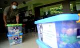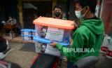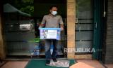 Relawan membawa bantuan paket nutrisi isolasi mandiri yang akan didistribusikan untuk pasien Covid-19 di Kantor Dompet Dhuafa, Ciputat, Tangerang Selatan, Banten, Rabu (4/8). Dari awal Juli hingga saat ini Dompet Dhuafa telah mendistribusikan sebanyak 176 bantuan paket nutrisi isolasi mandiri kepada warga di wilayah Jabodetabek dan program ini akan masih terus berjalan selama pandemi Covid-19.Prayogi/Republika. (FOTO : Prayogi/Republika.)
