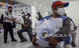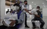 Petugas Dinas Perhubungan (Dishub) memberikan bantuan sosial (Bansos) sembako kepada seorang pelaku usaha transportasi darat di Terminal Leuwipanjang, Kota Bandung, Rabu (4/8). Kementerian Perhubungan Direktorat Jenderal Perhubungan Darat bersama Pemerintah Daerah (Pemda) Provinsi Jawa Barat membagikan sebanyak 1.000 bantuan sosial sembako kepada pelaku transportasi darat seperti sopir, kondektur, pengemudi ojek daring, dan warga sekitar yang terdampak pandemi Covid-19. Foto: Republika/Abdan Syakura (FOTO : REPUBLIKA/ABDAN SYAKURA)