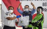 Gubernur Jawa Barat Ridwan Kamil (kiri) menerima bantuan masker saat kegiatan pemberian bantuan sosial (Bansos) bagi pelaku usaha transportasi darat di Terminal Leuwipanjang, Kota Bandung, Rabu (4/8). Kementerian Perhubungan Direktorat Jenderal Perhubungan Darat bersama Pemerintah Daerah (Pemda) Provinsi Jawa Barat membagikan sebanyak 1.000 bantuan sosial sembako kepada pelaku transportasi darat seperti sopir, kondektur, pengemudi ojek daring, dan warga sekitar yang terdampak pandemi Covid-19. Foto: Republika/Abdan Syakura (FOTO : REPUBLIKA/ABDAN SYAKURA)
