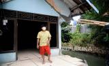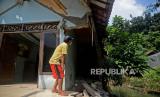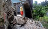 Warga mengamati rumah yang lonsor di Jalan Kaja II RT 14/RW 11, Ciracas, Jakarta, Kamis (5/8). Kejadian lonsor yang terjadi pada Senin (2/8) tersebut diduga akibat tergerus air dan mengakibatkan satu rumah yang berada di bibir Kali Cipinang mengalami rusak. Warga berharap lonsor tersebut segera diperbaiki agar tidak mengakibatkan banjir jika hujan turun. (FOTO : Prayogi/Republika.)