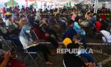 Warga antre mengikuti vaksinasi COVID-19 massal di Kudus, Jawa Tengah, Kamis (5/8/2021). Menurut data dari Kementerian Kesehatan per 5 Agustus 2021, jumlah warga Jawa Tengah yang sudah divaksin sebanyak 5,272,966 jiwa atau 18 persen dari target total sasaran sebanyak 28,727,805 jiwa. (FOTO : Antara/Yusuf Nugroho)