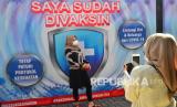 REPUBLIKA.CO.ID, KUDUS -- Warga berfoto dengan latar belakang "Saya Sudah Divaksin" usai mengikuti vaksinasi COVID-19 massal di Kudus, Jawa Tengah, Kamis (5/8/2021). Menurut data dari Kementerian Kesehatan per 5 Agustus 2021, jumlah warga Jawa Tengah yang sudah divaksin sebanyak 5,272,966 jiwa atau 18 persen dari target total sasaran sebanyak 28,727,805 jiwa.