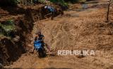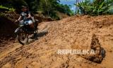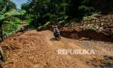 REPUBLIKA.CO.ID, LEBAK -- Warga menggunakan roda dua melintas di jalan yang longsor di Desa Banjarsari, Lebak, Banten, Jumat (6/8/2021). Hujan deras yang mengguyur daerah tersebut mengakibatkan jalan antardesa tertimbun longsor pada Rabu (5/8/2021) malam, dikhawatirkan terjadi longsor kembali jika hujan karena tanah yang masih labil.