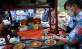 REPUBLIKA.CO.ID, BOGOR -- Pedagang menyiapkan makanan ketoprak saat pembagian bantuan makanan untuk warga yang sedang isolasi mandiri (isoman) di halaman Gedung Brajamustika, Kota Bogor, Jawa Barat, Jumat (6/8/2021).