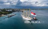 REPUBLIKA.CO.ID, TUAL -- KRI Bima Suci yang merupakan kapal latih tiang tinggi Taruna Akademi Angkatan Laut (AAL) tingkat III angkatan ke-68 berlabuh di perairan Tual, Maluku, Sabtu (7/8/2021). KRI Bima Suci dipimpin Komandan Satgas OBS 2021 Letkol Laut (P) Waluyo akan bersandar selama tiga hari di Tual untuk mendukung latihan praktek (Lattek) Kartika Jala Krida (KJK) 2021 yang dipimpin Palaklat KJK Letkol Laut (P) Khairul Anwar.
