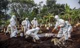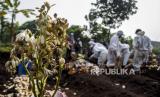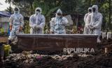 Petugas mengenakan alat pelindung diri (APD) memakamkan jenazah dengan protokol Covid-19 di lahan baru pemakaman khusus Covid-19 di TPU Kihafit, Cimahi Selatan, Kota Cimahi, Ahad (8/8). Pemerintah Kota Cimahi menambah lahan baru TPU Khusus Covid-19 dengan luas 5.500 meter persegi yang dapat menampung 170 liang, setelah dua lahan pemakaman sebelumnya yakni TPU Muslim Cipageran dan TPU Lebaksaat telah terisi penuh. Foto: Republika/Abdan Syakura (FOTO : REPUBLIKA/ABDAN SYAKURA)
