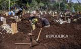 REPUBLIKA.CO.ID, BANDUNG -- Petugas menggali liang lahat di lahan baru pemakaman khusus Covid-19 di TPU Kihafit, Cimahi Selatan, Kota Cimahi, Ahad (8/8).