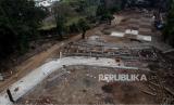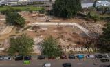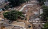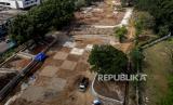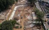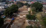 Suasana pembangunan Alun-Alun Kota Bogor di Jalan Kapten Muslihat, Kota Bogor, Jawa Barat, Senin (9/8). Pembangunan Alun-alun Kota Bogor yang didirikan di lahan eks Taman Topi atau Taman Ade Irma Suryani itu baru mencapai 10 persen dengan anggaran Rp 13,6 miliar dari bantuan Pemerintah Provinsi Jawa Barat dan ditargetkan rampung pada akhir tahun 2021. (FOTO : Republika/Putra M. Akbar)