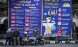 Sejumlah warga beraktivitas di depan spanduk informasi Covid-19 di Jalan Asia Afrika, Kota Bandung, Senin (9/8). Jelang berakhirnya Pemberlakuan Pembatasan Kegiatan Masyarakat (PPKM) Level 4 di Kota Bandung pada hari ini, Senin (9/8), kondisi arus lalu lintas dan aktivitas masyarakat di area publik terpantau ramai. (FOTO : REPUBLIKA/ABDAN SYAKURA)
