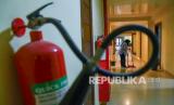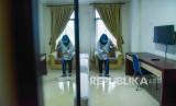 Petugas membersihkan area kamar Asrama Haji Medan, Sumatera Utara, Selasa (10/8/2021). Pemerintah Provinsi Sumatera Utara mengoperasikan Asrama Haji Medan sebagai tempat isolasi terpusat bagi pasien COVID-19 yang bergejala ringan dan sedang dengan kapasitas kamar tidur sebanyak 400 tempat tidur. (FOTO : ANTARA/Fransisco Carolio)