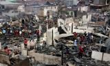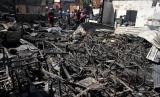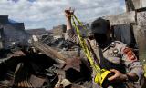 REPUBLIKA.CO.ID, MAKASSAR -- Anggota polisi memasang garis polisi di lokasi kebakaran di salah satu permukiman padat penduduk di Kecamatan Tamalate, Makassar, Sulawesi Selatan, Rabu (11/8/2021). Kebakaran tersebut menghanguskan sebanyak 110 unit rumah warga dan penyebabnya masih dalam penyelidikan polisi.
