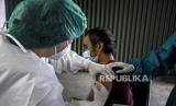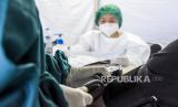 Petugas kesehatan memeriksa kesehatan pengunjung sebelum disuntik vaksin Covid-19 di Posko Vaksinasi Covid-19 di Paris Van Java (PVJ) Mall, Jalan Sukajadi, Kota Bandung, Kamis (12/8). Pemerintah Kota Bandung melalui Dinkes Kota Bandung dan Disdagin Kota Bandung menyediakan posko vaksinasi covid-19 dengan target 50 hingga 100 dosis vaksin per hari di pusat perbelanjaan untuk memfasilitasi pengunjung yang belum disuntik vaksin dan tidak memiliki sertifikat vaksinasi Covid-19. Foto: Republika/Abdan Syakura (FOTO : REPUBLIKA/ABDAN SYAKURA)