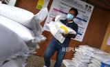 Petugas memindahkan bantuan beras di Kalurahan Umbulharjo, Sleman, Yogyakarta, Kamis (12/8). Sebanyak 266 beras untuk kompensasi PPKM Darurat disalurkan ke warga penerima manfaat di Umbulharjo. Pengambilan bantuan beras 10 kilogram warga hanya membawa KTP dan kartu keluarga. (FOTO : Wihdan Hidayat / Republika)