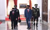Presiden Joko Widodo (kanan) dan Wapres Ma Maruf Amin (kiri) berjalan menuju lokasi Upacara Penganugerahan Tanda Kehormatan Republik Indonesia di Istana Negara, Jakarta, Kamis (12/8/2021). Pemerintah memberikan Tanda Kehormatan Republik Indonesia kepada 355 penerima yang terdiri dari para mantan pejabat negara, pengusaha, ilmuwan, Warga Negara Asing, dan para tenaga kesehatan yang gugur saat menangani COVID-19 berdasarkan Keputusan Presiden tertanggal 4 Agustus 2021. (FOTO : ANTARA/Biro Pers Media Setpres/Lukas/Han)