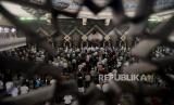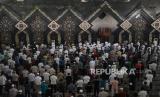 Sejumlah umat Islam mengikuti sholat Jumat berjamaah dengan menerapkan jaga jarak di Masjid At-Tin, Jakarta, Jumat (13/8). Masjid At-Tin kembali menggelar ibadah shalat Jumat pertama kalinya setelah kegiatan shalat Jumat dihentikan lantaran mengikuti ketentuan Pemberlakuan PPKM Darurat. Masjid At-tin pun menerapkan pembatasan jumlah jamaah secara terbatas yakni 25 persen dari kapasaitas serta mematuhi protokol kesehatan. Prayogi/Republika. (FOTO : Prayogi/Republika.)