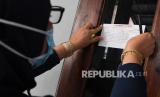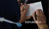Pengurus RW menuliskan data warga yang sudah dan belum divaksin di stiker vaksin sebelum ditempelkan di rumah warga di lingkungan RW 07, Kebayoran Lama Utara, Jakarta, Jumat (13/8/2021). Pemasangan stiker vaksin yang digagas oleh Ketua RW tersebut untuk mendata seluruh warga yang sudah dan belum divaksinasi COVID-19 beserta alasannya agar warga yang belum divaksin bisa mengikuti vaksinasi. (FOTO : Antara/Hafidz Mubarak A)
