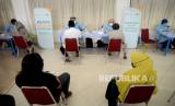 Warga melakukan pendaftaran vaksinasi COVID-19 di Aula A.H Nasution Masjid Cut Meutia, Jakarta, Sabtu (14/8). Bank Syariah Indonesia berkolaborasi dengan Pemprov DKI Jakarta dan Dewan Masjid Indonesia menggelar vaksinasi COVID-19 dari masjid ke masjid sebagai upaya membantu mempercepat target vaksinasi pemerintah secara maksimal, terutama pada wilayah-wilayah padat penduduk yang tidak tersentuh sentra vaksinasi.Prayogi/Republika. (FOTO : Prayogi/Republika)