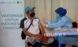 Petugas kesehatan menyuntikan vaksin COVID-19 kepada warga di Aula A.H Nasution Masjid Cut Meutia, Jakarta, Sabtu (14/8). Bank Syariah Indonesia berkolaborasi dengan Pemprov DKI Jakarta dan Dewan Masjid Indonesia menggelar vaksinasi COVID-19 dari masjid ke masjid sebagai upaya membantu mempercepat target vaksinasi pemerintah secara maksimal, terutama pada wilayah-wilayah padat penduduk yang tidak tersentuh sentra vaksinasi.Prayogi/Republika. (FOTO : Prayogi/Republika.)