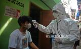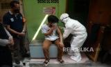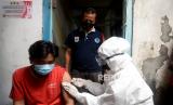 Petugas Kesehatan memeriksa kesehatan warga sebelum disuntikan vaksin saat pelaksanaan vaksinasi COVID-19 secara door to door yang merupakan bagian dari kegiatan vaksinasi Merdeka di Kawasan RW 02, Karang Anyar, Sawah Besar, Jakarta, Sabtu (14/8). Polsek sawah besar menggelar vaksinasi dengan mendatangi rumah ke rumah warga yang belum vaksin sebagai upaya mewujudkan heard immunity di Jakarta. (FOTO : Prayogi/Republika.)