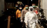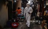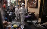 Petugas Kesehatan berjalan menuju rumah warga saat pelaksanaan vaksinasi COVID-19 secara door to door yang merupakan bagian dari kegiatan vaksinasi Merdeka di Kawasan RW 02, Karang Anyar, Sawah Besar, Jakarta, Sabtu (14/8). Polsek sawah besar menggelar vaksinasi dengan mendatangi rumah ke rumah warga yang belum vaksin sebagai upaya mewujudkan heard immunity di Jakarta.Prayogi/Republika (FOTO : Prayogi/Republika.)