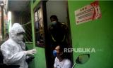 Petugas Kesehatan memeriksa riwayat kesehatan warga sebelum disuntikan vaksin saat pelaksanaan vaksinasi COVID-19 secara door to door yang merupakan bagian dari kegiatan vaksinasi Merdeka di Kawasan RW 02, Karang Anyar, Sawah Besar, Jakarta, Sabtu (14/8). Polsek sawah besar menggelar vaksinasi dengan mendatangi rumah ke rumah warga yang belum vaksin sebagai upaya mewujudkan heard immunity di Jakarta.Prayogi/Republika (FOTO : Prayogi/Republika.)