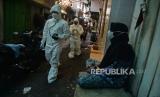 Petugas Kesehatan berjalan menuju rumah warga saat pelaksanaan vaksinasi COVID-19 secara door to door yang merupakan bagian dari kegiatan vaksinasi Merdeka di Kawasan RW 02, Karang Anyar, Sawah Besar, Jakarta, Sabtu (14/8). Polsek sawah besar menggelar vaksinasi dengan mendatangi rumah ke rumah warga yang belum vaksin sebagai upaya mewujudkan heard immunity di Jakarta.Prayogi/Republika (FOTO : Prayogi/Republika)
