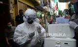 Petugas Kesehatan bersiap menyuntikkan vaksin kepada warga saat pelaksanaan vaksinasi COVID-19 secara door to door yang merupakan bagian dari kegiatan vaksinasi Merdeka di Kawasan RW 02, Karang Anyar, Sawah Besar, Jakarta, Sabtu (14/8). Polsek sawah besar menggelar vaksinasi dengan mendatangi rumah ke rumah warga yang belum vaksin sebagai upaya mewujudkan heard immunity di Jakarta. (FOTO : Prayogi/Republika.)