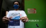 Warga menunjukan kartu vaksin menerima suntikan vaksin di rumahnya saat pelaksanaan vaksinasi COVID-19 secara door to door yang merupakan bagian dari kegiatan vaksinasi Merdeka di Kawasan RW 02, Karang Anyar, Sawah Besar, Jakarta, Sabtu (14/8). Polsek Sawah Besar menggelar vaksinasi dengan mendatangi rumah ke rumah warga yang belum vaksin sebagai upaya mewujudkan heard immunity di Jakarta.Prayogi/Republika (FOTO : Prayogi/Republika.)