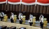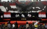 Pegawai melakukan geladi bersih pelaksanaan Sidang Tahunan MPR dan pidato kenegaraan presiden di Kompleks Parlemen, Senayan, Jakarta, Ahad (15/8). Geladi tersebut dilakukan agar Sidang Tahunan MPR RI, sidang bersama DPR RI-DPD RI dan Rapat paripurna DPR RI tahun 2021 pada 16 Agustus 2021 berjalan baik dan lancar.Presiden Joko Widodo beserta Wakil Presiden KH Maruf Amin direncanakan menghadiri sidang tersebut. (FOTO : Republika)