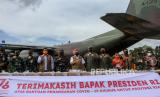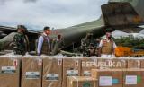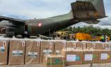 Petugas membongkar muat paket bantuan dari Presiden Joko Widodo dari pesawat hercules di Lanud Roesmin Nurjadin Pekanbaru, Riau, Ahad(15/8/2021). Pemerintah Pusat kembali mendistribusikan bantuan berupa konsentrator oksigen, vaksin COVID-19 serta obat-obatan guna percepatan penanganan pandemi di Provinsi Riau. (FOTO : ANTARA/Rony Muharrman)