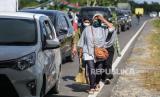 Warga terpaksa berjalan kaki akibat angkutan umum yang ditumpangi tidak membawa dokumen lengkap saat melewati penyekatan di Jalur Trans Kalimantan Sebangau, Palangkaraya, Kalimantan Tengah, Minggu (15/8/2021). Pemkot Palangkaraya mewajibkan bagi pelaku perjalanan jalur transportasi darat yang memasuki wilayah kota itu menunjukkan bukti sertifikat vaksin dan hasil usap antigen selama penerapan PPKM Level 4 guna menekan angka penularan COVID-19. (FOTO : ANTARA/Makna Zaezar)
