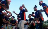 Sejumlah narapidana mengikuti lomba yel-yel menyambut HUT ke-76 RI di Rutan Klas IIB Kupang, NTT, Senin (16/8/2021). Rutan Klas IIB Kupang menggelar perlombaan yel-yel, tarik tambang, lari karung, dan baris-berbaris untuk memupuk rasa cinta tanah air bagi para narapinada di rutan tersebut. (FOTO : Antara/Kornelis Kaha)