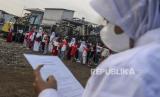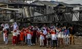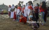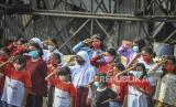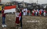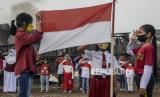 REPUBLIKA.CO.ID, JAKARTA -- Seorang anak dari Komunitas Kelas Jurnalis Cilik bersiap memakai masker sebelum melaksanakan upacara bendera di kawasan Belah Kapal, Cilincing, Jakarta, Selasa (17/8). Upacara yang diikuti sekitar 25 anak itu dalam rangka memperingati HUT Kemerdekaan ke-76 Republik Indonesia.