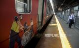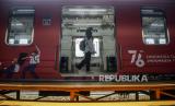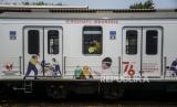 REPUBLIKA.CO.ID, JAKARTA -- Petugas menuntun penyandang tuna netra di dekat gerbong KRL Commuter Line bertemakan Kemerdekaan Republik Indonesia ke-76 di Stasiun Jakarta Kota, Jakarta, Selasa (17/8). Dalam rangka peringatan HUT ke-76 Kemerdekaan Republik Indonesia, KAI Commuter memasang livery khusus pada gerbong kereta dan meluncurkan Kartu Multi Trip edisi khusus kemerdekaan RI.