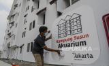 REPUBLIKA.CO.ID, JAKARTA -- Pekerja memasang plang hunian Kampung Susun Akuarium, Penjaringan, Jakarta, Selasa (17/8). Pemerintah Provinsi DKI Jakarta telah menyelesaikan pembangunan hunian Kampung Susun Akuarium tower Blok B dan D. Kampung Susun Akuarium ditargetkan dapat mulai ditempati oleh warga mulai Agustus 2021.