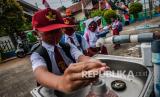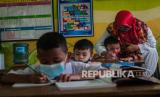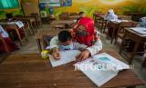 REPUBLIKA.CO.ID, LEBAK -- Siswa didampingi gurunya mengikuti proses kegiatan belajar mengajar di SDN 01 Narimbang, Lebak, Banten, Rabu (18/8/2021). Pemerintah Kabupaten Lebak membuka kegiatan belajar mengajar secara tatap muka di sekolah dengan wajib mengikuti protokol kesehatan COVID-19 seperti pembatasan kapasitas kelas hanya diisi18 siswa serta waktu belajar dibatasi selama tiga jam.