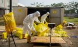 Petugas memindahkan kantong yang berisi limbah medis yang berbahan berbahaya dan beracun (B3) di Rumah Sakit Darurat COVID-19 (RSDC) Wisma Atlet, Kemayoran, Jakarta, Selasa (17/8/2021). Menteri Koordinator Bidang Kemaritiman dan Investasi, Luhut Binsar Pandjaitan, menyatakan perlunya tindakan yang cepat dan tepat terkait pengelolaan limbah medis COVID-19 yang mencakup Bahan Berbahaya dan Beracun (B3) yang pada Juli 2021 terdapat peningkatan mencapai 18 juta ton. (FOTO : ANTARA/M Risyal Hidayat)