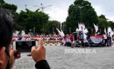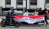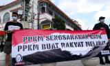 REPUBLIKA.CO.ID,YOGYAKARTA -- Peserta aksi dari Serikat Buruh Sejahtera Indonesia (SBSI) menggelar aksi penolakan perpanjangan PPKM Level 4 di Titik Nol Yogyakarta, Rabu (18/8).