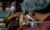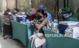 Tenaga kesehatan menyuntikan vaksin Covid-19 kepada warga di UPN Veteran Jakarta, Rabu (18/8). UPN Veteran Jakarta mengadakan program vaksinasi terbuka bagi masyarakat umum dengan total kuota vaksin sebanyak 1.000 dosis dalam rangka meningkatkan herd imunity. Republika/Putra m. Akbar (FOTO : Republika/Putra M. Akbar)