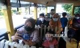 REPUBLIKA.CO.ID,BOGOR -- Sejumlah warga naik bus Uncal usai mengikuti vaksinasi Covid-19 massal di Puri Begawan, Baranangsiang, Kota Bogor, Jawa Barat, Jumat (20/8/2021).
