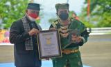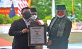 Gubernur Sumbar, Mahyeldi (kanan) menerima piagam Museum Rekor Dunia Indonesia (MURI), usai kegiatan Memasak Rendang Sedunia di Padang, Sumatera Barat, Sabtu (21/8/2021). Kegiatan tersebut mendapatkan rekor MURI karena memiliki peserta terbanyak yang memasak rendang secara daring. (FOTO : ANTARA/Iggoy el Fitra)